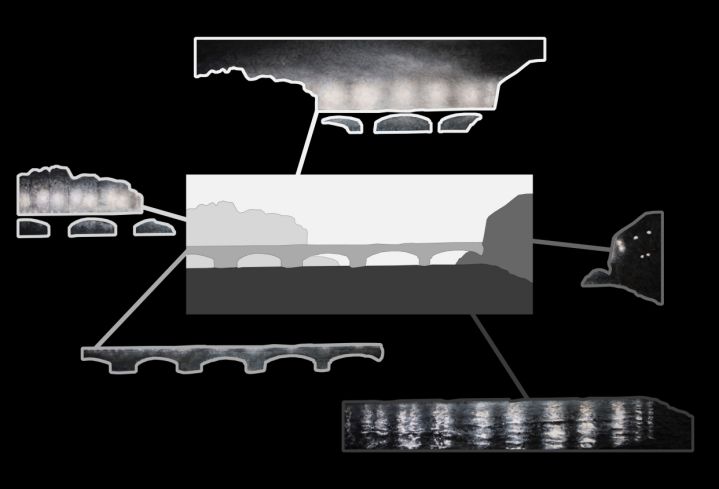Les masses se répartissent en trois grandes zones distinctes: le ciel, le fleuve, et le pont. Les deux petites masses sur chaque côté assurent la liaison et viennent équilibrer l’ensemble.