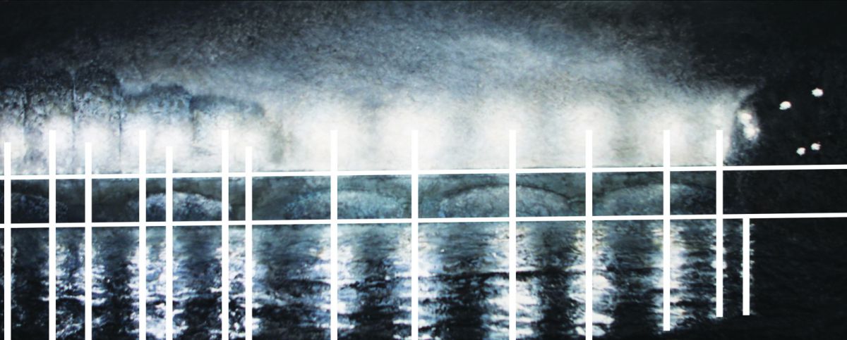 Une barre d’imeubles se dessine dans le fond à gauche, un pont traverse le milieu du tableau, à droite se trouve une masse sombre parsemée de quelques lumières.