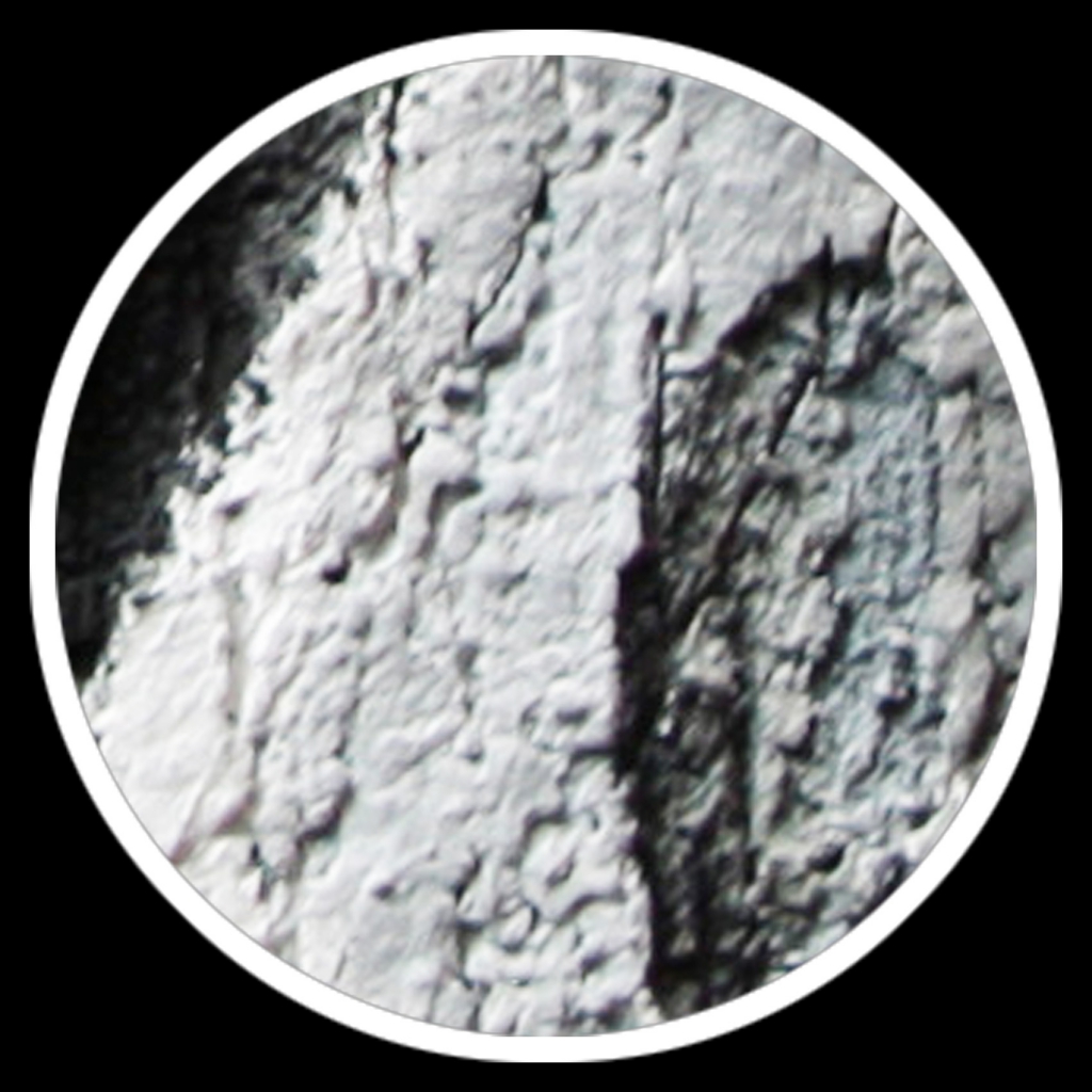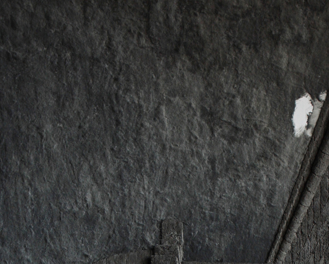 Le noir n’est pas uniforme. Plusieurs noirs sont utilisés et combinés à différents types de matières: noir pour fresque en charge de peinture sur le coton, noir d’ivoire en mélange avec l’eau artificielle ou en charge de peinture sur les parties minérales. Ces noirs entrent en opposition maximale avec le mélange de plâtre, colle et blanc de titane.