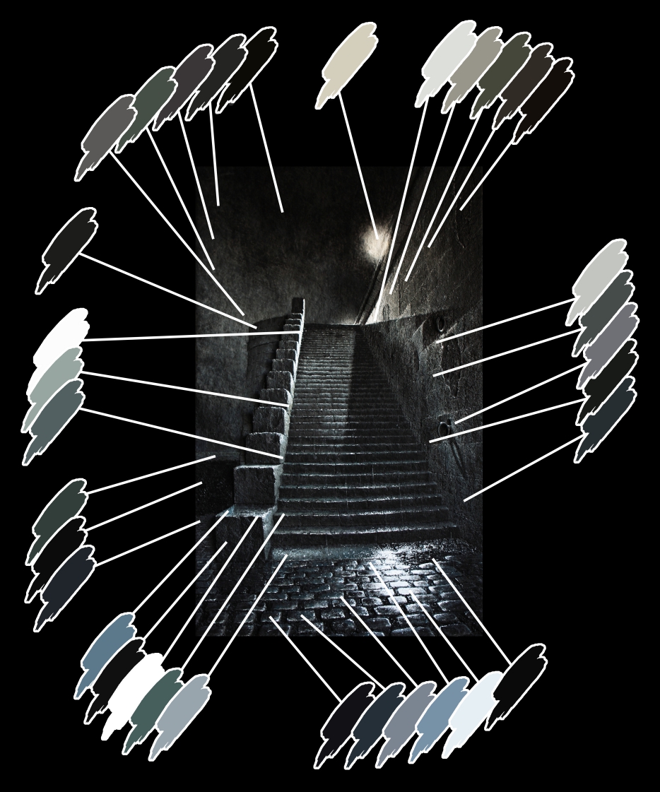 Les gris intermédiaires sont donnés soit par les matières elles-même, soit par différentes peintures, soit par modulation avec des charges de pigments, soit par le jeu de la lumière extérieure qui va accrocher les volumes et projeter des ombres véritables dans les creux.